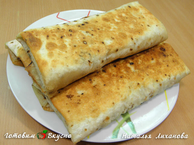 Можно свернуть лаваш конвертиком (как обычно мы сворачиваем блинчики ) и поджарить с двух сторон на небольшом количестве подсолнечного масла, в этом случае он будет хрустящим. Подается такой лаваш в горячем виде.
