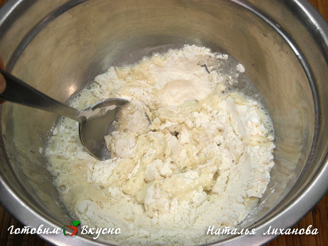 Теперь приготовим тесто для лепешек с сырной начинкой. Это совсем не трудно, в отдельную миску высыпаем муку и постепенно добавляем пиво, при этом все время помешиваем. Размешиваем до получения теста, затем перекладываем на посыпанную мукой поверхность и месим руками.