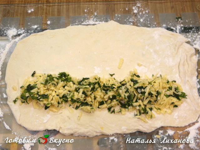 Получившееся тесто делим на три части, каждую раскатываем в виде прямоугольника и на край выкладываем начинку.