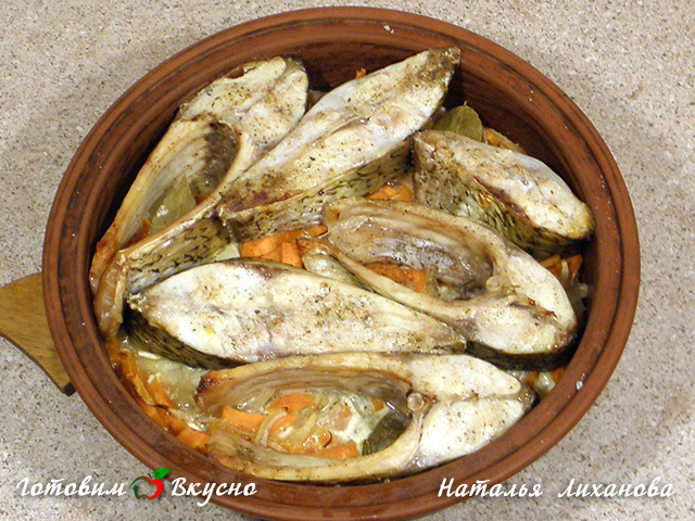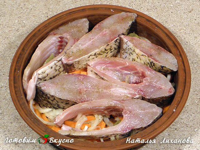 Сверху выкладываем кусочки рыбы также присаливаем ее и добавляем перец.