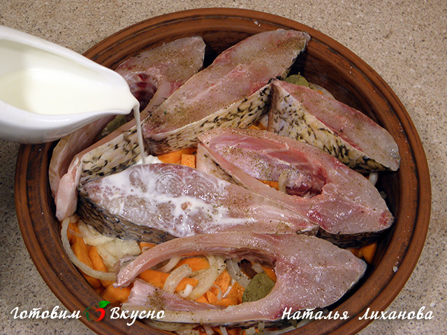 Готовое блюдо достаем из духовки. Лещ с овощами в молочном соусе получается очень ароматным.