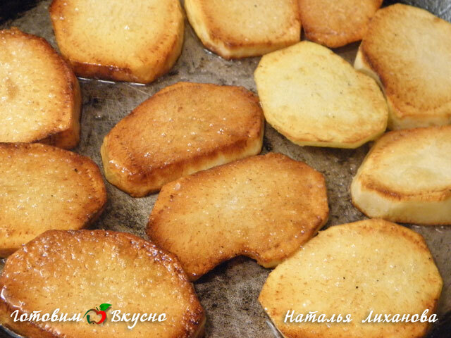 Также как и баклажаны нарезаем картофель немного солим и обжариваем.