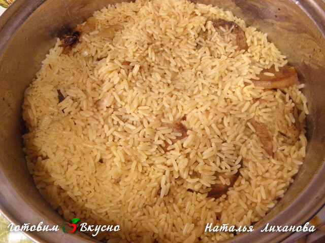 Берем кастрюлю с толстым дном и укладываем все слоями – курица, лук, синенькие, картофель , не забываем про специи ( можно немного еще присолить). Сверху кладем рис и аккуратно (чтобы не нарушить слои) заливаем все бульоном, он должен покрывать рис на 1-1,5 см выше. Ставим кастрюлю на большой огонь, крышку приоткрываем и варим так пока не выкипит лишняя жидкость, а рис начнет ,как говорится, «пыхтеть» (примерно через 5-7 мин.).