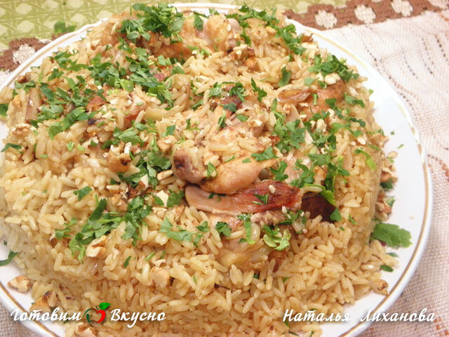 Берем большое блюдо, накрываем им кастрюлю, быстро и аккуратно переворачиваем. Осторожно снимаем кастрюлю и подаем маклюбе с курицей, посыпав рублеными орехами и петрушкой.