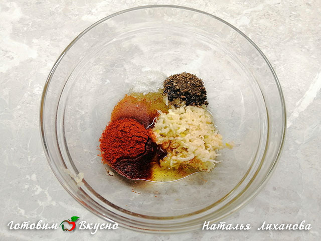 В небольшой емкости смешиваем соль, паприку, измельченный чеснок, черный перец и оливковое масло. Перемешиваем до состояния кашицы.