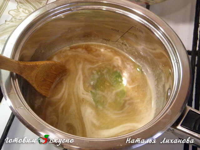 Для приготовления медового соуса к рыбе трем на мелкой терке цедру одного лимона и выжимаем сок. В сотейнике растапливаем сливочное масло, добавляем мед, цедру и сок лимона, мускатный орех, имбирь, лавровый лист, соевый соус и ½ стак. бульона (после варки рыбы). Доводим до кипения.