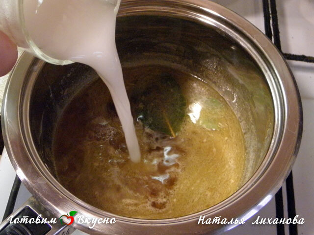 В оставшемся бульоне (1/2 стак.) разводим крахмал. Помешивая, вливаем крахмал в соус и варим до загустения (около 1 минуты).