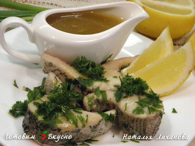 Подаем медовый соус к отварной рыбе с лимоном и зеленью. Приятного аппетита!