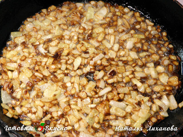Лук убираем со сковороды специальной ложкой с отверстиями, чтобы осталось масло. Лук выбрасываем, а горячим маслом поливаем морковь со специями и чесноком, хорошо перемешиваем. Добавляем уксус и еще раз перемешиваем. Затем помещаем