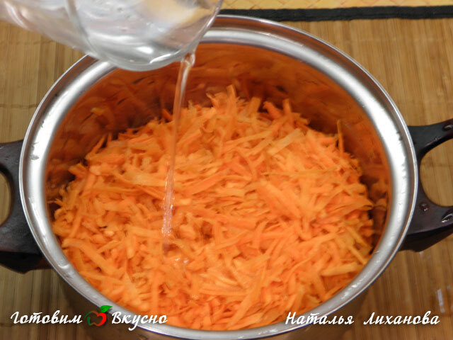 Чтобы приготовить морковную запеканку без муки, натираем на крупной терке предварительно почищенную морковь. Кладем морковь в кастрюлю, добавляем 100 мл воды и тушим до мягкости на маленьком огне.