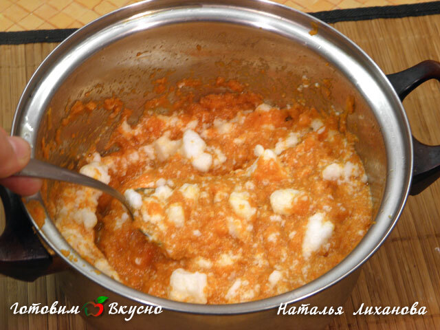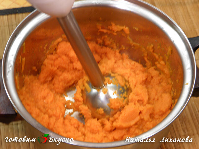 При помощи блендера делаем морковное пюре, к нему добавляем сливочное масло, сахар и яичные желтки все хорошо вымешиваем и отставляем остывать.