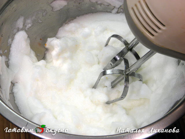 В оставшиеся яичные белки добавляем щепотку соли и взбиваем миксером (или венчиком) до крепкой пены.
