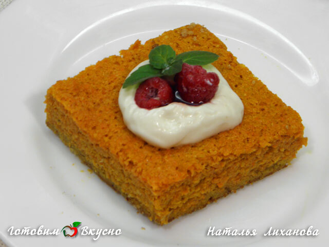 Подаем морковную запеканку вместе со сметаной и свежими ягодами. Очень вкусно!