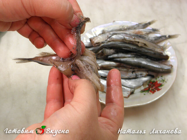 Чтобы приготовить мойву жареную с луком и сметаной, головы у рыбы отрезаем, убираем внутренности и хребет.