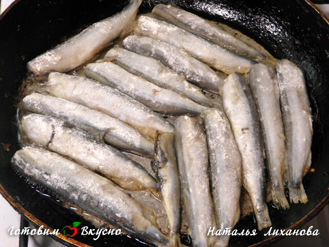 Рыбу солим, обваливаем в муке и жарим на подсолнечном масле.