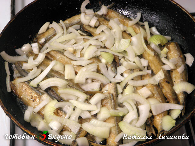 Когда рыба поджарится, засыпаем ее луком, порезанным полукольцами (или мельче).