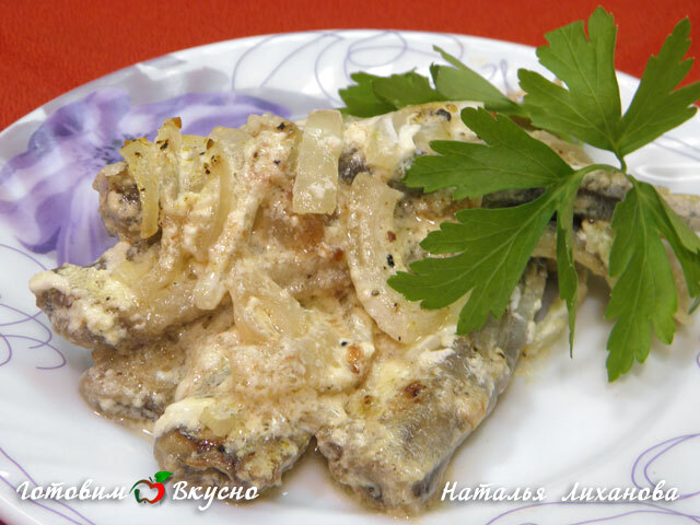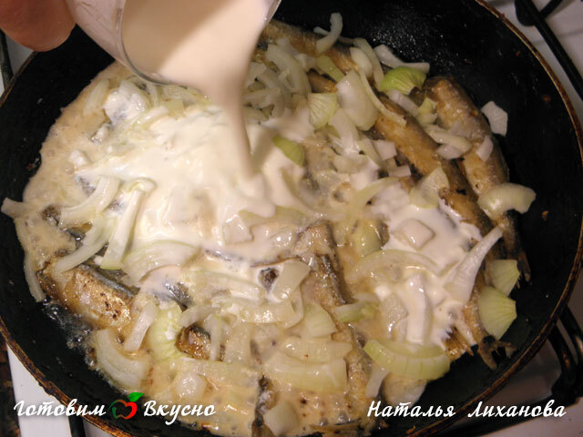 Сверху заливаем рыбу сметаной, разведенной с водой. Солим, перчим по вкусу, накрываем крышкой и тушим минут 10-15.