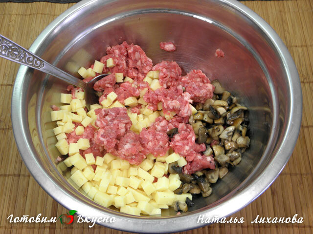 Для приготовления мясного рулета из лаваша с грибами и сыром грибы нарезаем на небольшие кусочки и слегка обжариваем на сливочном масле. Сыр нарезаем небольшими кубиками. Смешиваем грибы, сыр, фарш, добавляем соль, перец и все хорошенько перемешиваем.