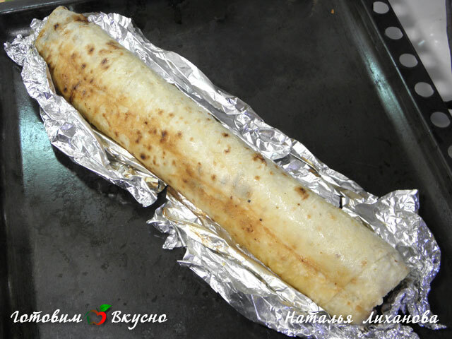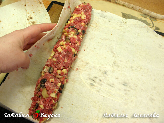Выкладываем поучившийся фарш сверху лаваша, равномерно распределив его, и сворачиваем в рулет.