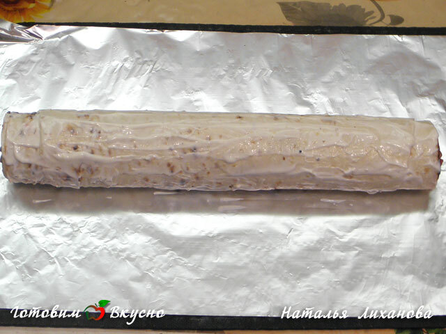 Затем рулет смазываем майонезом и заворачиваем его в фольгу.