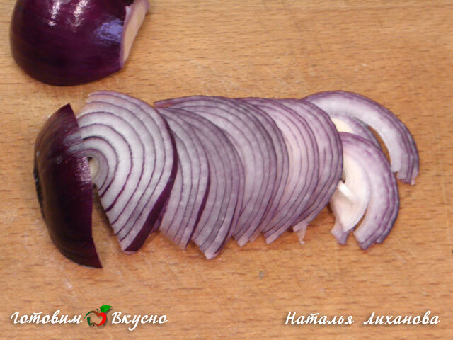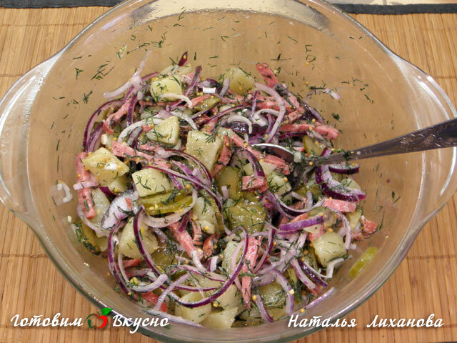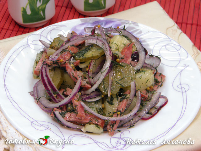 Салат получается сытным, немного острым и будет прекрасной закуской к крепким напиткам. В рецепте используется довольно много лука, но острота его теряется благодаря заправке и он становится маринованным. Салат очень вкусный и особенно подойдет для холодных зимних дней, когда хочется чего-то жирного, сытного и острого.