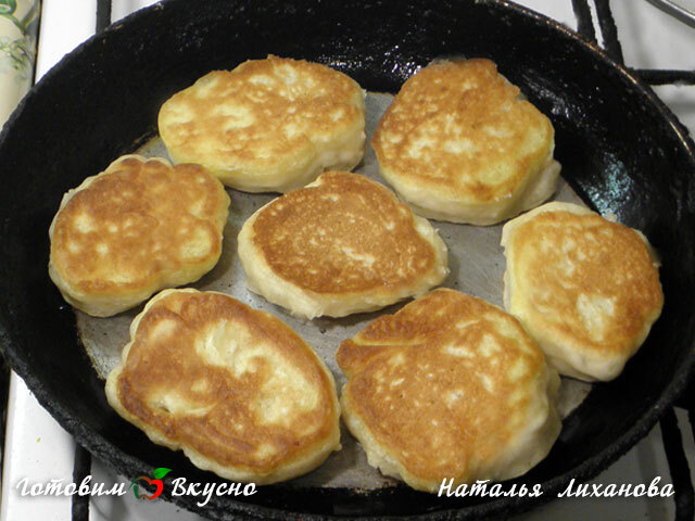 Жарим оладьи на среднем огне, когда одна сторона поджарится, переворачиваем на другую, накрываем крышкой и жарим до готовности.