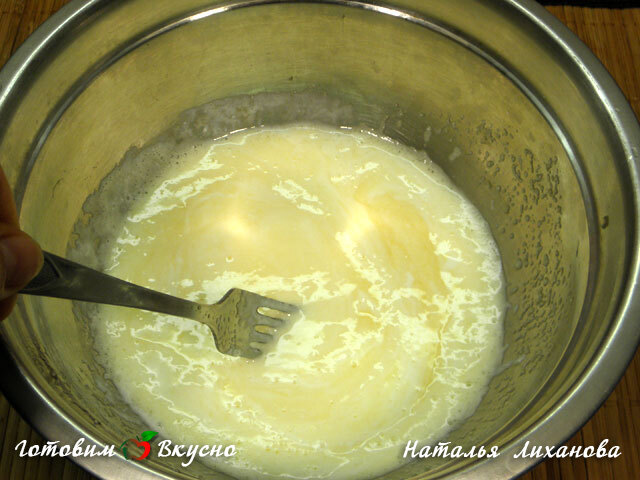 Взбиваем яйца вместе с сахаром, добавляем кефир и перемешиваем.