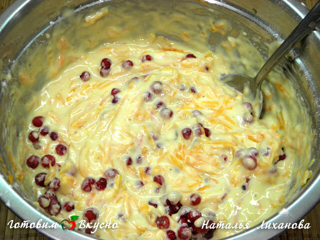 Добавляем тыкву, смородину, соду и муку. Все хорошо перемешиваем.