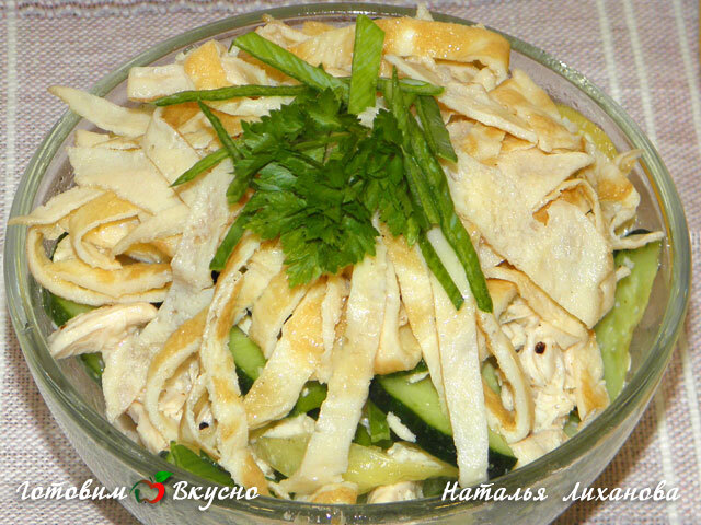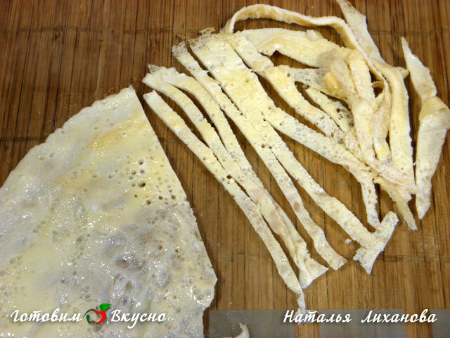 Для украшения овощного салата с курицей и омлетом понадобятся тонкие полоски омлета. Для этого слегка взбиваем яйцо с солью и поджариваем его с одной стороны. Получившийся омлет нарезаем тонкой лапшой.