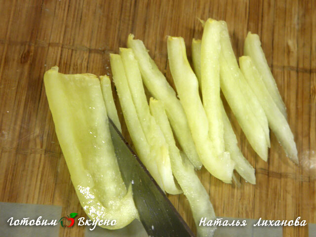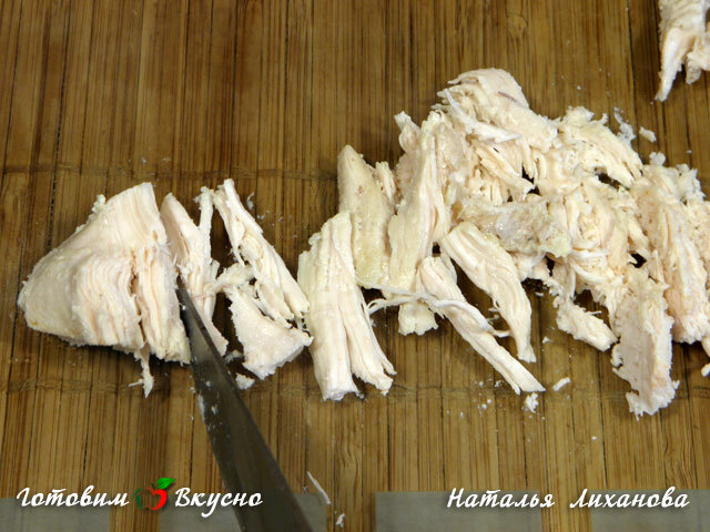 Куриную грудку отвариваем. Остывшее мясо нарезаем брусочками.