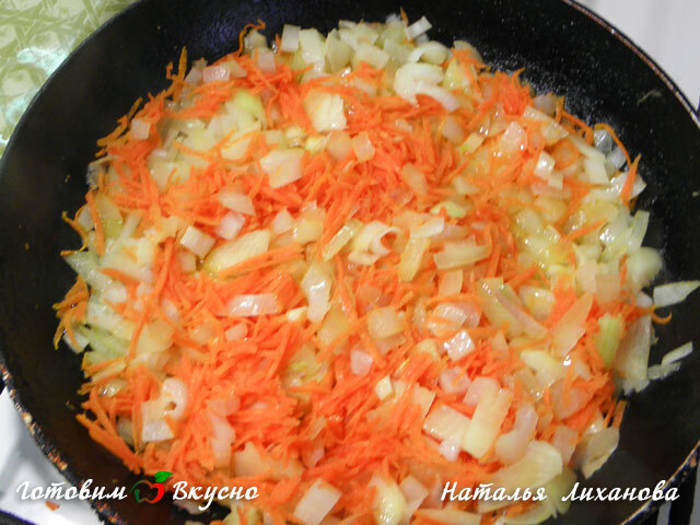 Лук и морковь мелко нарезаем и слегка пассируем до прозрачности лука. За пару минут до готовности добавляем перетертый вместе с солью чеснок.