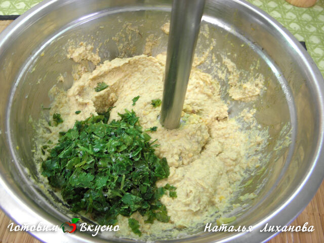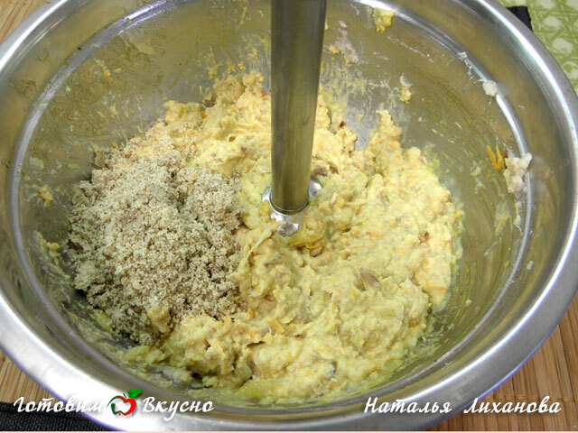 В сваренную фасоль добавляем лук с морковкой, орехи и измельчаем смесь блендером.