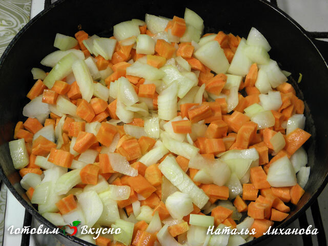 Чтобы приготовить паштет из куриной печени, разогреваем сковороду с растительным маслом и кладем крупно нарезанные лук и морковь. Обжариваем все минуты 2-3.