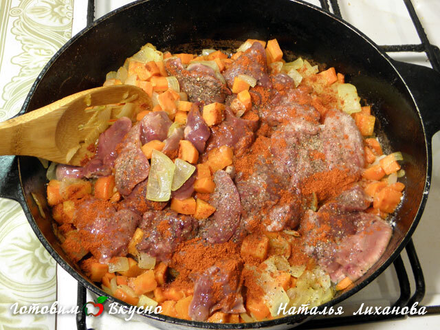 Печень очищаем от пленок и выкладываем в сковороду. Сюда же добавляем соль, перец, паприку, закрываем крышкой и тушим до готовности (15-20 мин.)