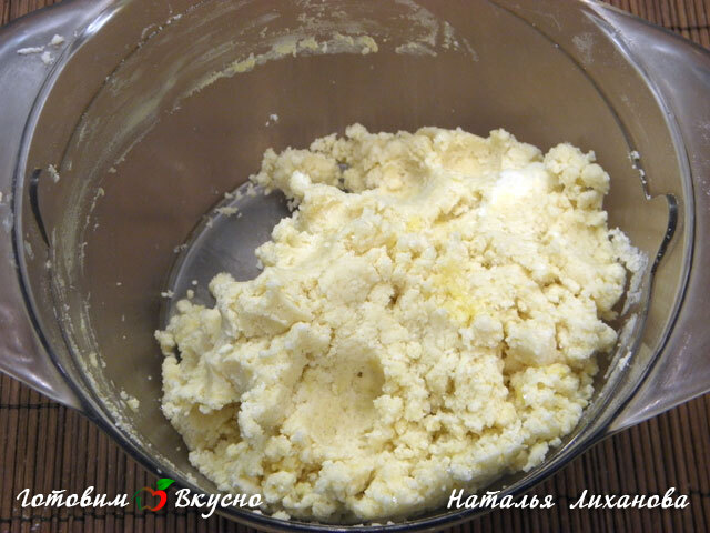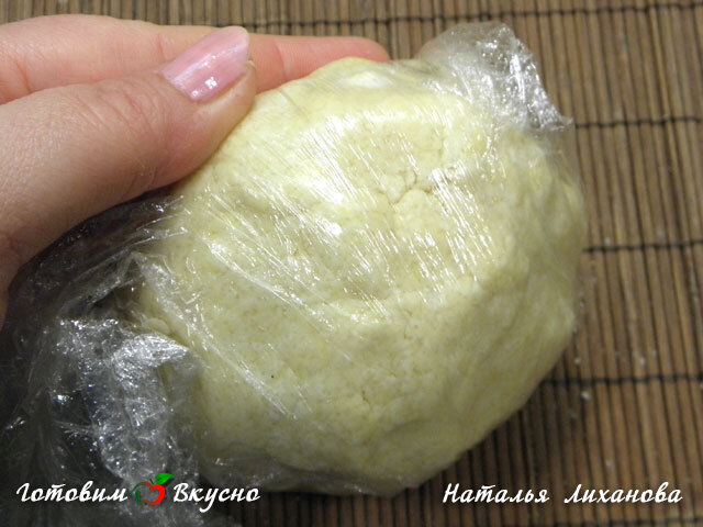 Собираем тесто (долго не вымешивать), заворачиваем в пищевую пленку и убираем на пол часа в холодильник.