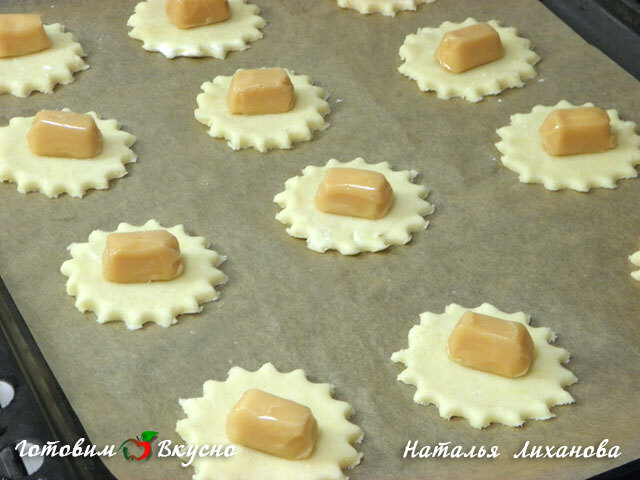 Затем тесто раскатываем в пласт толщиной примерно 5 мм и вырезаем из него кружки (звездочки квадратики и т.д.), они должны быть чуть больше диаметра конфет. Выкладываем кружочки на противень, покрытый бумагой для выпечки и сверху выкладываем по конфетке.