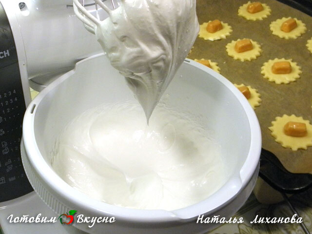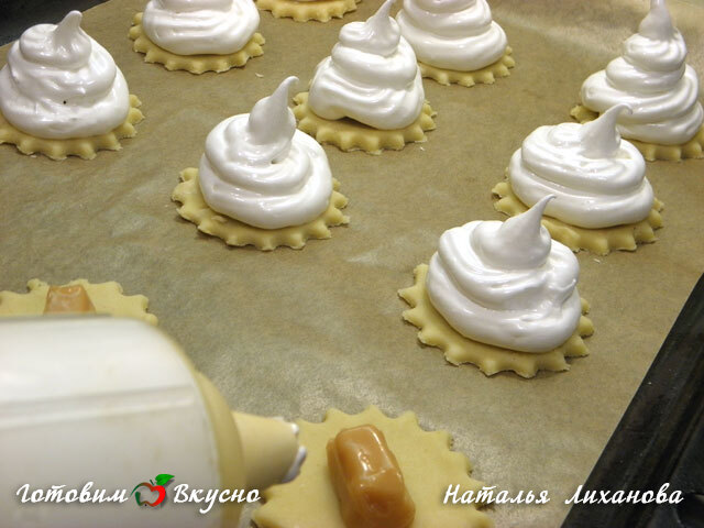 При помощи кондитерского шприца (мешочка, корнета или просто пакета, проделав в нем отверстие) выкладываем безе так, чтобы оно закрывало конфету со всех сторон.