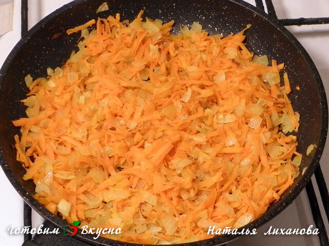 Приготовим начинку. Обжариваем на растительном масле мелко порезанный лук и натертую на крупной терке морковь, до мягкости.
