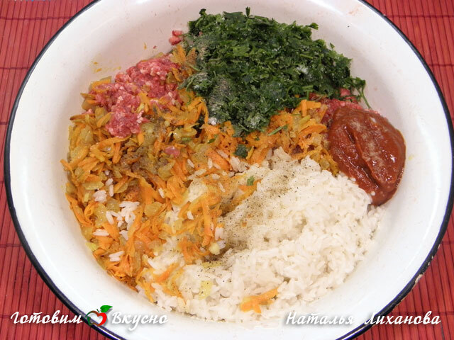 В большой миске соединяем фарш, рис, обжаренные лук с морковью, помидоры, кетчуп, измельченный чеснок, мелко порезанную зелень, соль, сахар и перец. Все тщательно перемешиваем (удобнее это делать руками).