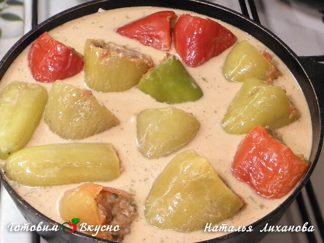 Теперь приготовим томатно-сметанный соус. В сковороду с высокими бортами или сотейник кладем сметану, кетчуп и заливаем воду. Перемешиваем. Солим и перчим по вкусу. В соус выкладываем фаршированный перец. Тушим перец на небольшом огне, под крышкой 40-60 мин.