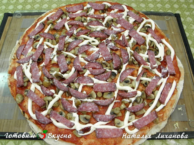 Колбасу необходимо порезать, так как в дальнейшем пиццу будет легче нарезать.
