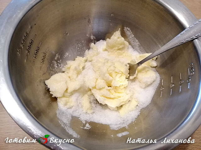 Чтобы приготовить пирог с малиной в сметанной заливке соединяем мягкое масло и сахар, взбиваем миксером, недолго масса должна соединиться и стать немного пышнее. Это можно сделать и при помощи вилки.