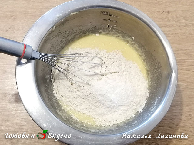 Добавляем яйца и сметану, перемешиваем до однородности. Теперь засыпаем муку с разрыхлителем, снова все перемешиваем.