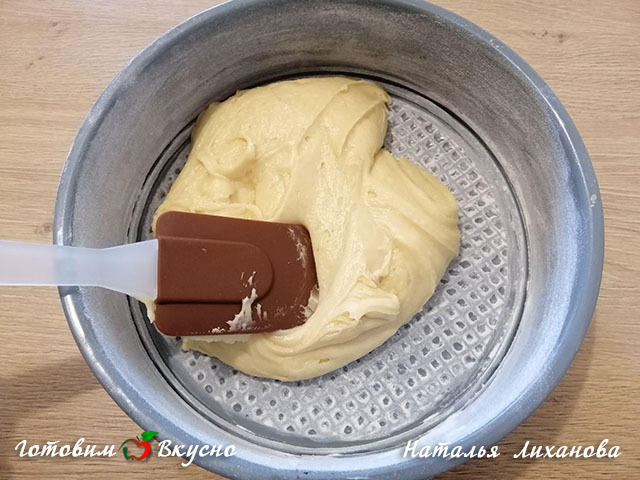 Форму я смазала маслом и присыпала мукой. Выкладываем тесто в форму, разравниваем его.