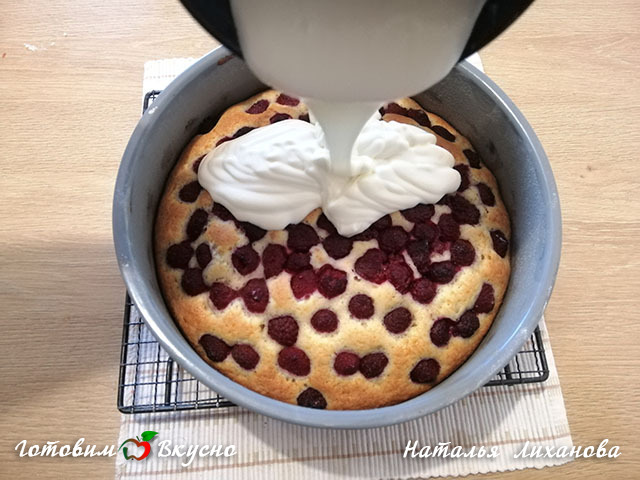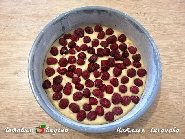 Выкладываем сверху малину. Выпекаем пирог 35 минут в разогретой до 180 градусов духовке. Пока выпекается пирог смешиваем сметану и сахар.