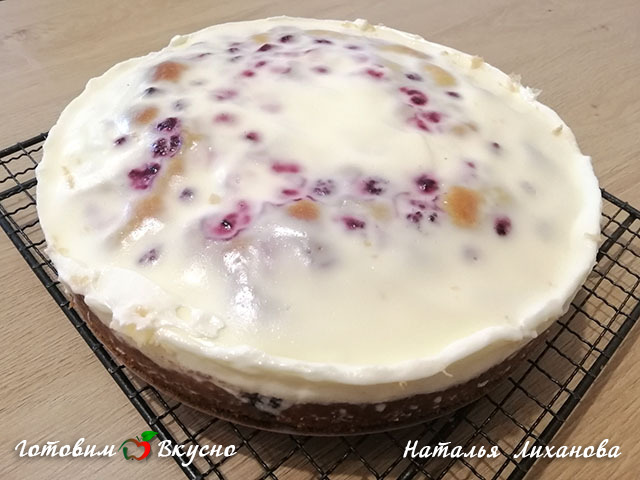 Достаем из духовки готовый пирог (проверяем готовность деревянной шпажкой) и еще горячим заливаем сметаной с сахаром. Остужаем сначала на столе, а потом ставим в холодильник, чтобы сметанный крем застыл.