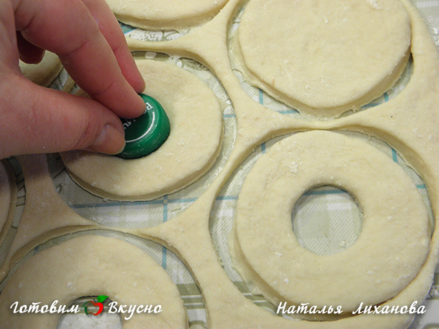 Тесто раскатываем в пласт толщиной 0,5-0,7 см и при помощи стакана или специальной формы вырезаем круги. Внутри каждого круга вырезаем меньшее отверстие, при помощи рюмки или крышки.