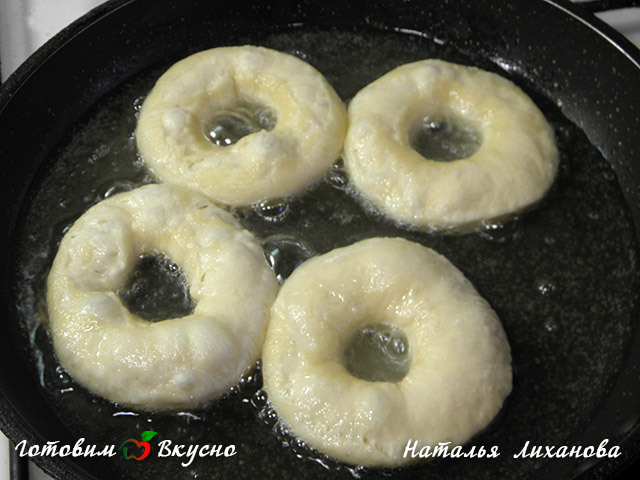 В сковороде разогреваем масло (достаточно много, его должно быть около 1 см). Выкладываем в хорошо разогретое масло пончики, жарим на среднем огне с двух сторон до румяности.