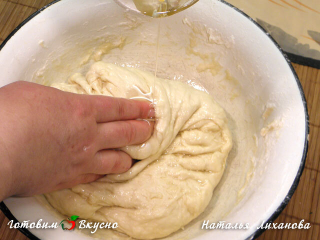 В конце замеса добавляем растительное масло и вымешиваем до тех пор, пока тесто перестанет прилипать к рукам и к миске. Оно должно быть однородным и не сильно крутым. Готовое тесто слегка присыпаем мукой, накрываем полотенцем и ставим в теплое место без сквозняков.