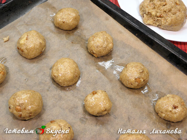 Соединяем овсяные хлопья, мед, разрыхлитель, соль, растительное масло и перемешиваем. Добавляем орехи и хорошенько перемешиваем. Из получившегося теста скатываем шарики размером с грецкий орех. Противень застилаем пергаментом и раскладываем наши шарики на небольшом расстоянии друг от друга.